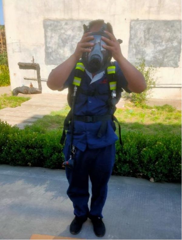 2、員工進行實操,在規(guī)定時間內(nèi)正確佩戴正壓式呼吸器。